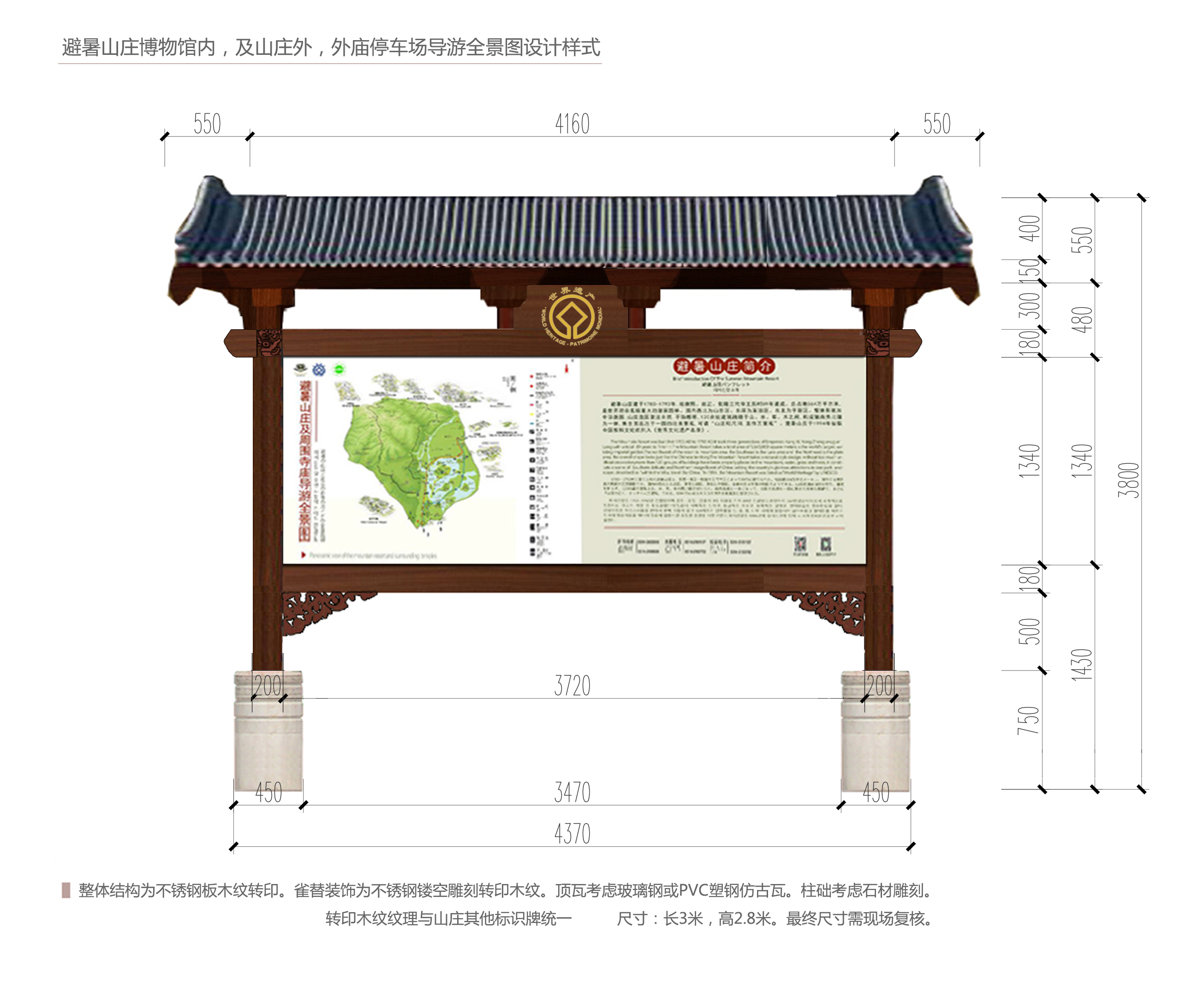 按照承德市人民政府办公室印发的《避暑山庄及周围寺庙景区整改提升专项工作方案》要求,在避暑山庄及周围寺庙外5个停车场内,各设置景区导游全景图1块,由我公司邀请有资质的单位进行制作和施工,现将有关事项通知如下: